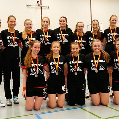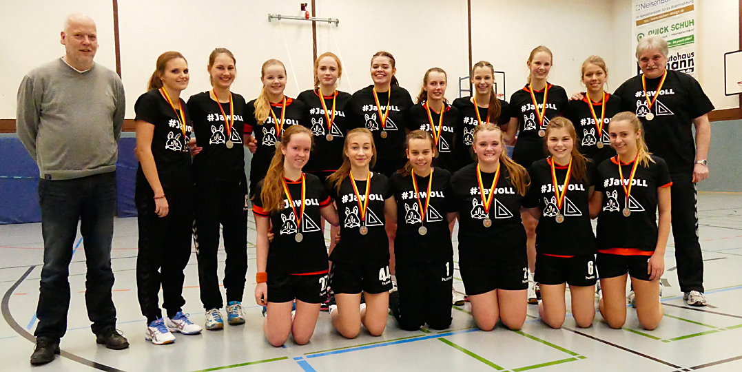 Ebenfalls Meister ist die weibliche B-Jugend. Die Mädels unter der Leitung von Willy und Katharina Wältermann mussten sich nur einmal geschlagen geben. Staffelleiter Eckard Rädel (links im Bild) vom Handballkreis Gütersloh war gekommen und überreichte nach dem Sieg gegen den Herzebrocker SV unter dem Jubel der mitgereisten Zuschauer die Siegermedaillen.