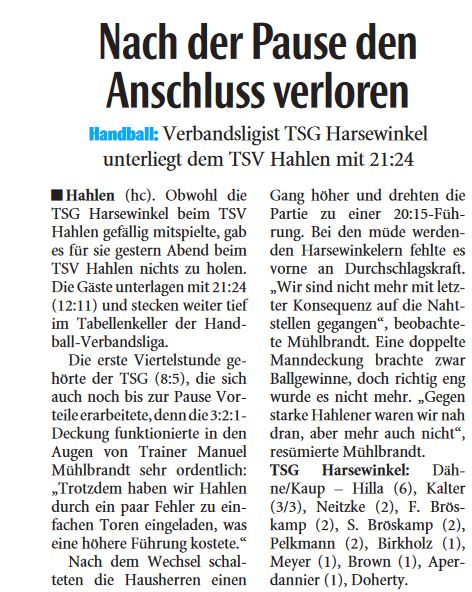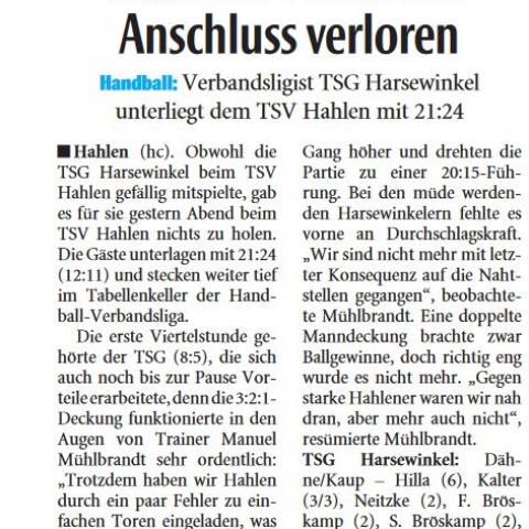 Die NW berichtet über die 24 : 21 Niederlage der 1. Herren beim TSV Hahlen