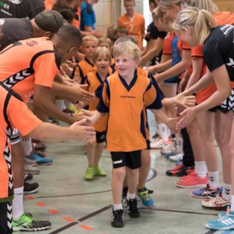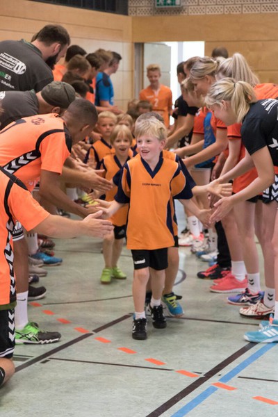 Zum Schluß konnten die Kinder noch ein bißchen Handball mit den "Großen " spielen und die Eltern durften sich das mit einer Tasse Kaffee und einem Stück Kuchen oder auch einer Bratwurst und einem Bier auf der Tribüne anschauen.