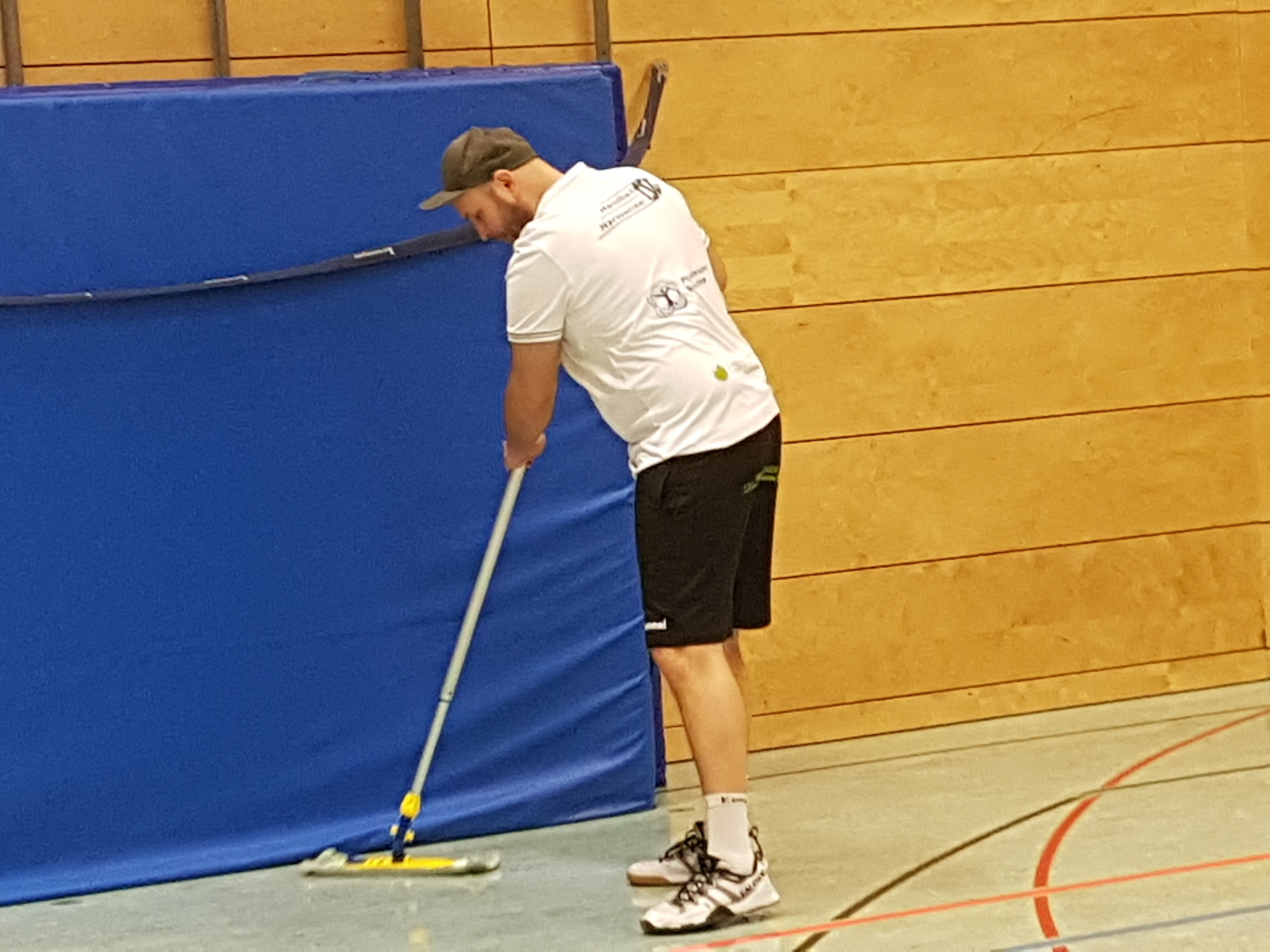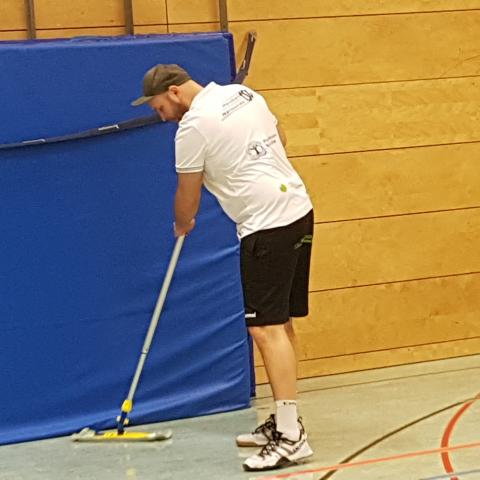 Im Anschluss an den grandiosen 39:21 (20:11)-Heimerfolg gegen die HSG TuS/EK Spradow wischt Coach Manuel Mühlbrandt für seine Mannschaft die Halle!