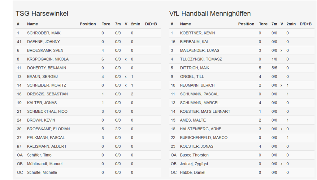 Das Endergebnis beim Spiel gegen Mennighüffen lautete 27 : 28. Schade. Zur Halbzeit hatte die TSG noch 17 : 14 geführt! Gutes Spiel mit vollem Einsatz. /div>