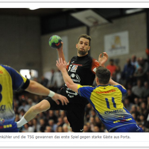 Gleich am ersten Spieltag der neuen Handballsaison hat die HSG Porta der TSG Harsewinkel eine wichtige Lektion erteilt: Nur mit Schönspielen kann die Mannschaft ihrer Favoritenrolle in der Verbandsliga nicht gerecht werden. Erst als der namhaft verstärkte Oberligaabsteiger am Freitagabend vor weit über 400, erst spät aus den Puschen kommenden Zuschauern die Trumpfkarten Kampf, Einsatz und Dynamik ausspielte, reichte es, um den besorgniserregenden 5:10-Rückstand über das unbefriedigende 13:15 zur Pause in einen erleichtert bejubelten 28:26-Sieg umzubiegen.