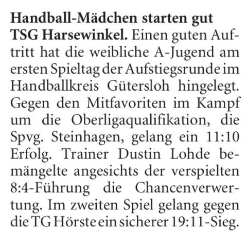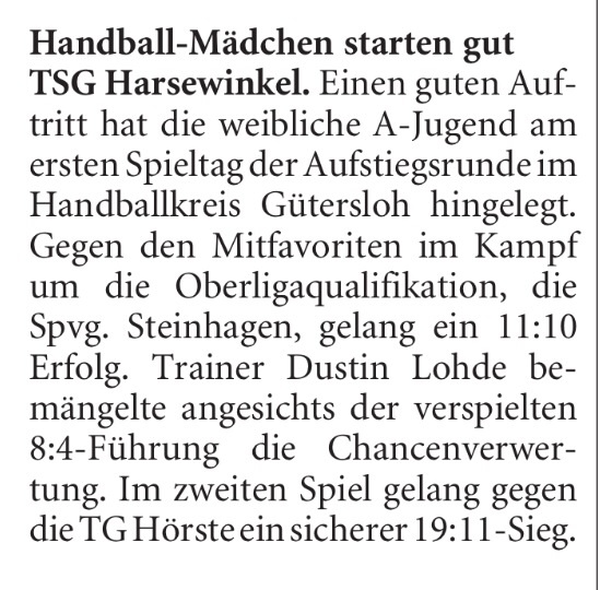 Mit einer wirklich engagierten Deckungsleistung gelang es uns, das Spiel über 30min im Griff zu behalten, auch wenn es nie so eng hätte werden müssen. Nach einer zwischenzeitlichen 8:4 Führung, wurde es zum Ende auf Grund vieler Zeitstrafen auf unserer Seite nochmal eng. Endstand 11:10 gegen Steinhagen.