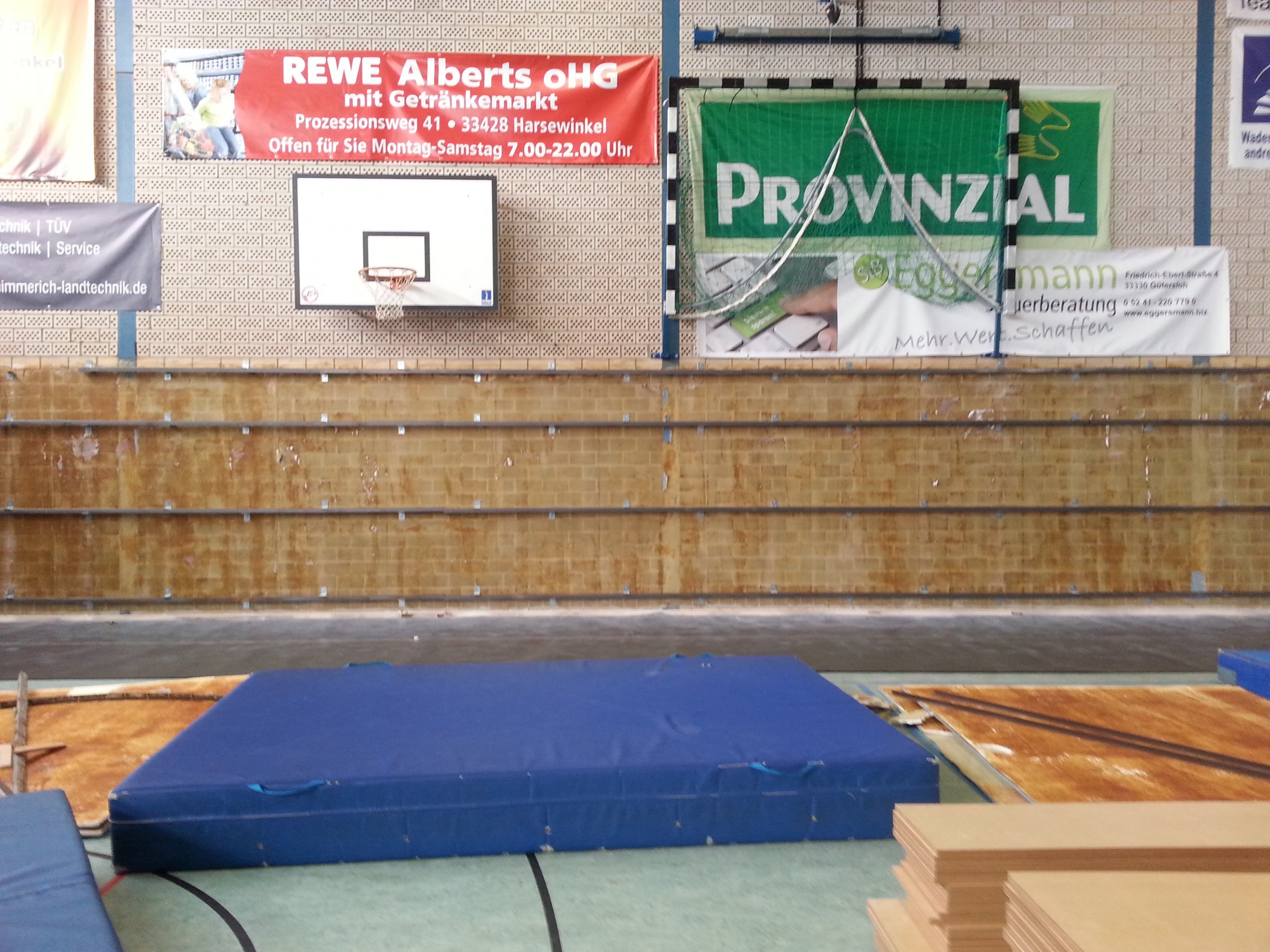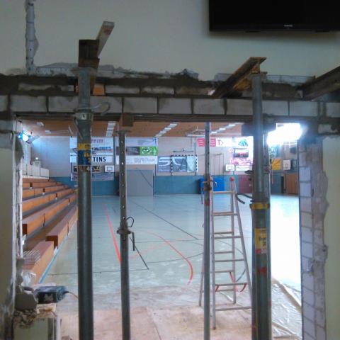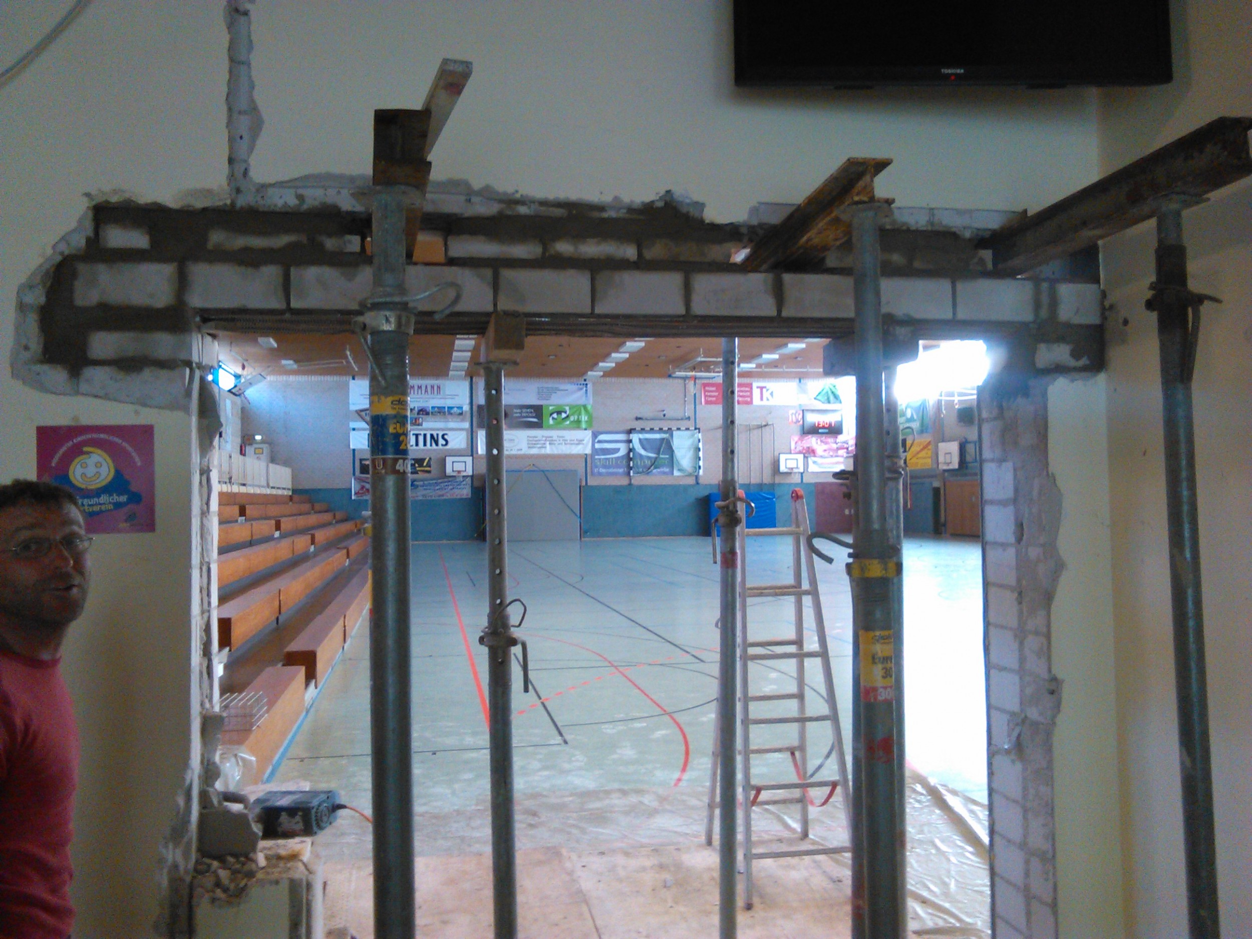 Die Türen mussten aus Gründen des Brandschutzes verbreitert werden. Woesty´s Erbe - der nach seinem doppelten Handbruch installierte Stoffprallschutz - wird nun nach einigen Jahrzehnten ausgetauscht. Die Arbeiten gehen planmässig voran - so dass mit dem Beginn des Schulunterrichtes der neue Prallschutz installiert sein wird.