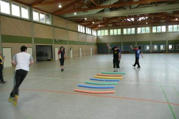 Vor allem ging es Carsten um die Koordination. Er machte mit unseren Torwarten mehrere Übungen bei den Arme und Beine links und rechts verschiedene Bewegungen gleichzeitig machen mussten. Zum Beispiel: linken Arm kreisen, rechten Arm ausstrecken, anwinkeln, dabei in Steppschritten über Markierungen springen. Weiterhin lag ihm das Ausdauertraining am Herzen. Denn der Torwart muss gerade in den letzten 10 - oft spiel entscheidenden - Minuten genau so schnell reagieren wie am Anfang des Spiels. Diese mentale Anspannung kann nur von einem durchtrainierten Torwart geleistet werden.