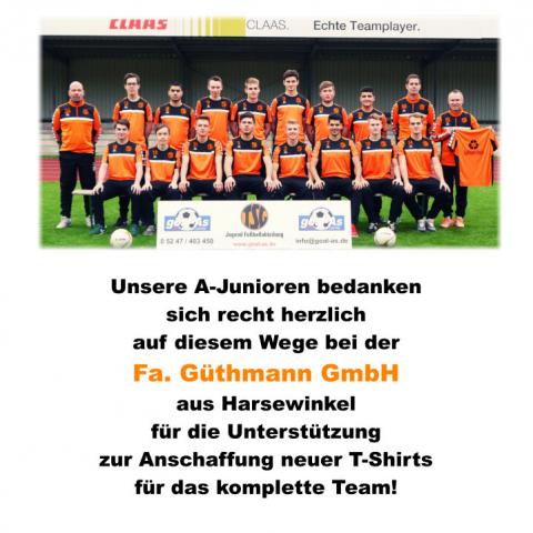Über neue T-Shirts konnte sich vor kurzem unser ältestes Juniorenteam freuen. Die A-Junioren schafften sich mit Unterstützung der Fa. Güthmann GmbH einen neuen Satz T-Shirts in vereinsfarben an. Vielen Dank im Namen aller Aktiven! /div>