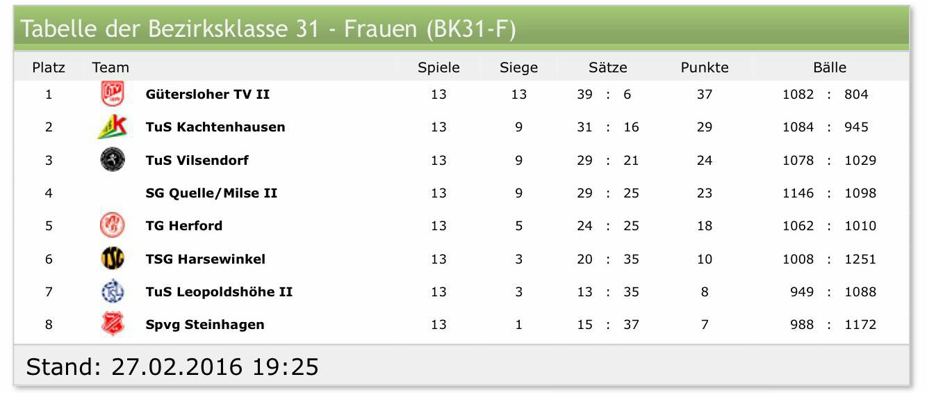 Am 27. Februar 2016 spielte die Damenmannschaft des TSG Harsewinkel gegen die Mannschaft des TuS Kachtenhausen in Vilsendorf. Die Mannschaft startete mit viel Motivation und guter Laune gegen den Tabellenzweiten. Denn noch nach zwei Sätzen, welche sie mit 16:25 und 15:25 verloren, holten sie sich knapp aber sicher den 3. Satz mit 25:22. Leider reichte die Kraft für den Sieg nicht aus und der 4. Satz ging 10:25 für TuS Kachtenhausen aus.
