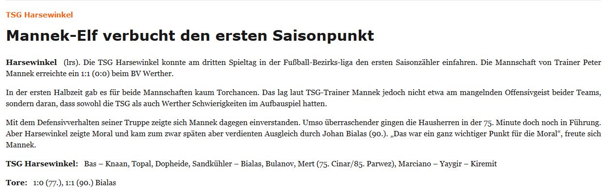 Unsere 1. kann gegen Werther den ersten Punkt einfahren. In einem Spiel auf Augenhöhe, gab es völlig zurecht keinen Sieger. Nach einem Rückstand kamen die Jungs aber inletzter Minute zum Ausgleich.