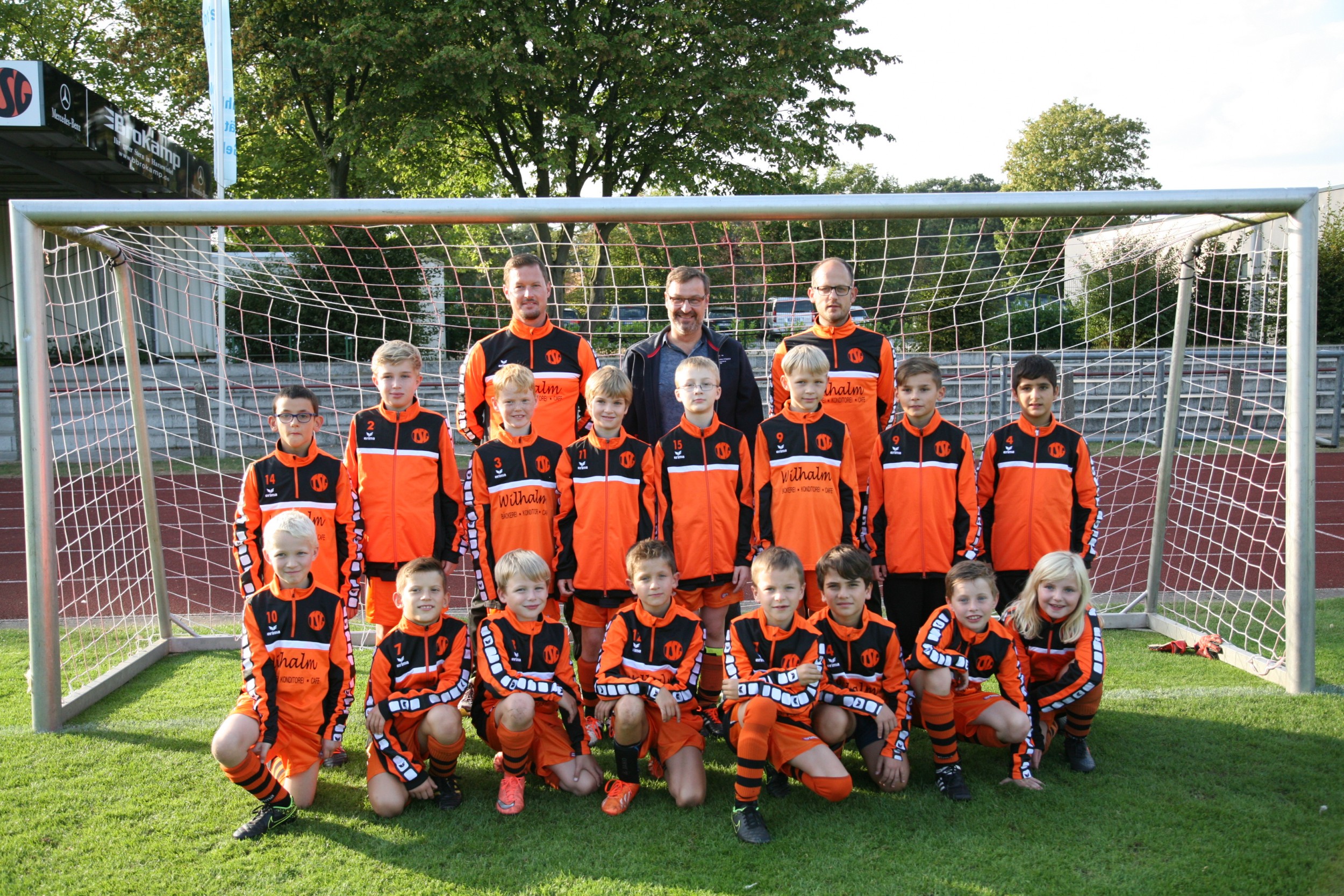 Die E-Jugend der TSG Harsewinkel Fußball Junioren (2007er U10 Jahrgang) bedankt sich bei der Bäckerei Wilhalm und bei der Hirsch Apotheke am Alten Markt für die Ausstattung mit neuen Trainingsoberteilen und Präsentationsjacken