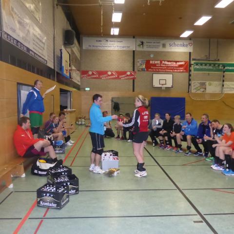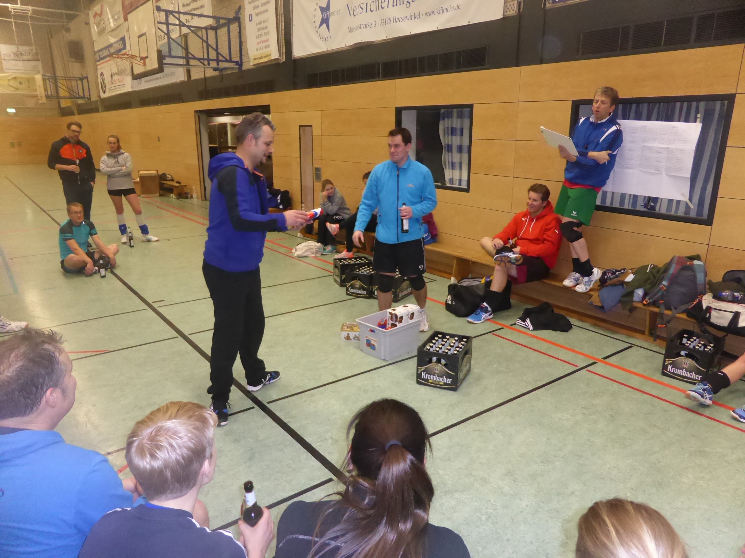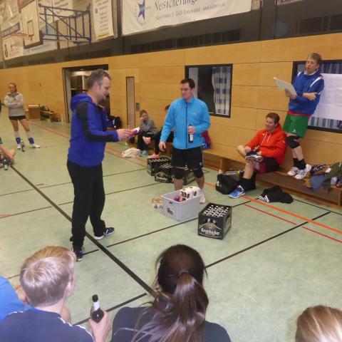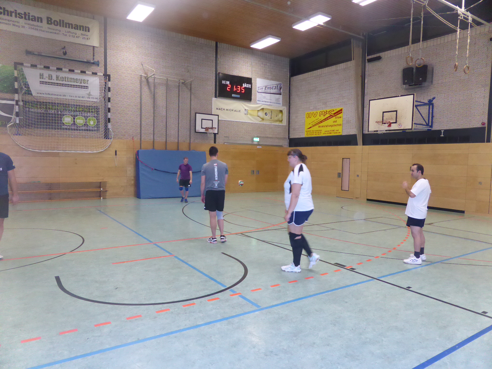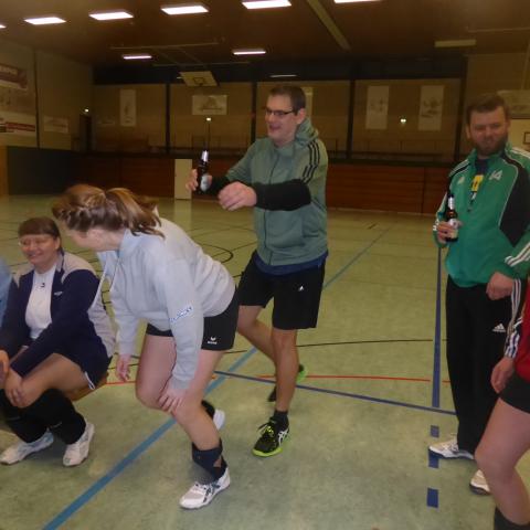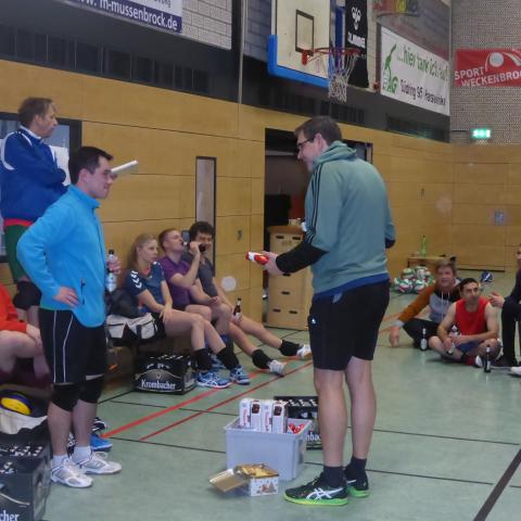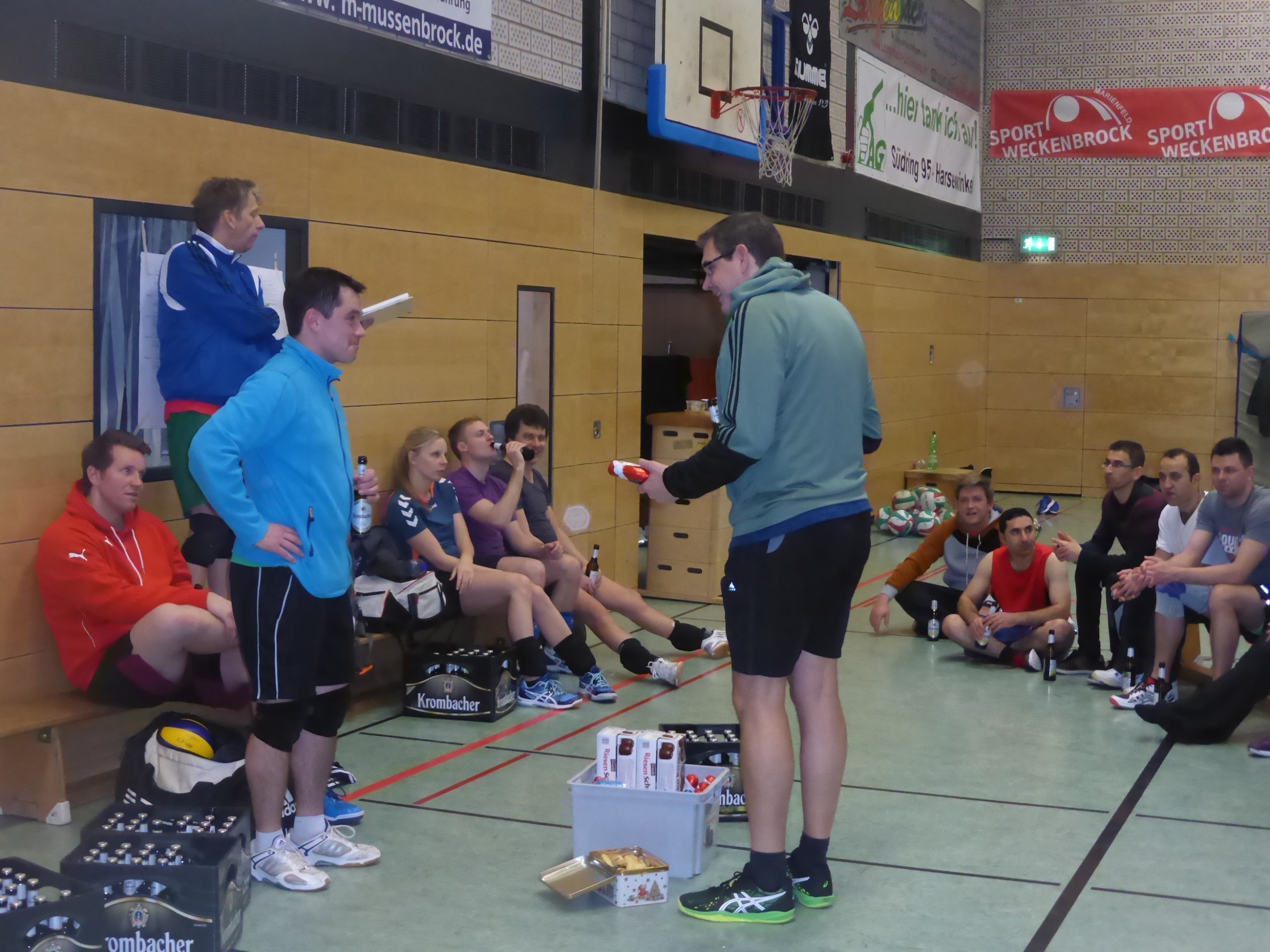 Zuerst wurden sechs weihnachtliche Teams ausgelost wie z. B. Christkinder oder Nikoläuse. Dann startete, nach kurzer Aufwärmphase, das Turnier. Jedes Team hatte fünf Spiele zu bestreiten, die jeweils zwei Sätze à 10 Minuten dauerten. Bei diesem schönen Weihnachtsturnier stand natürlich, wie in jedem Jahr, vor allen Dingen der Spaß im Vordergrund, auch wenn es leider einen Verletzten gab. Auf diesem Wege ganz viele Genesungswünsche.