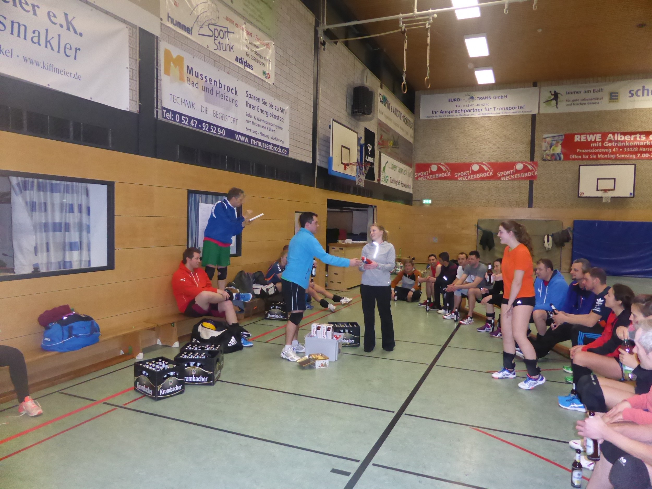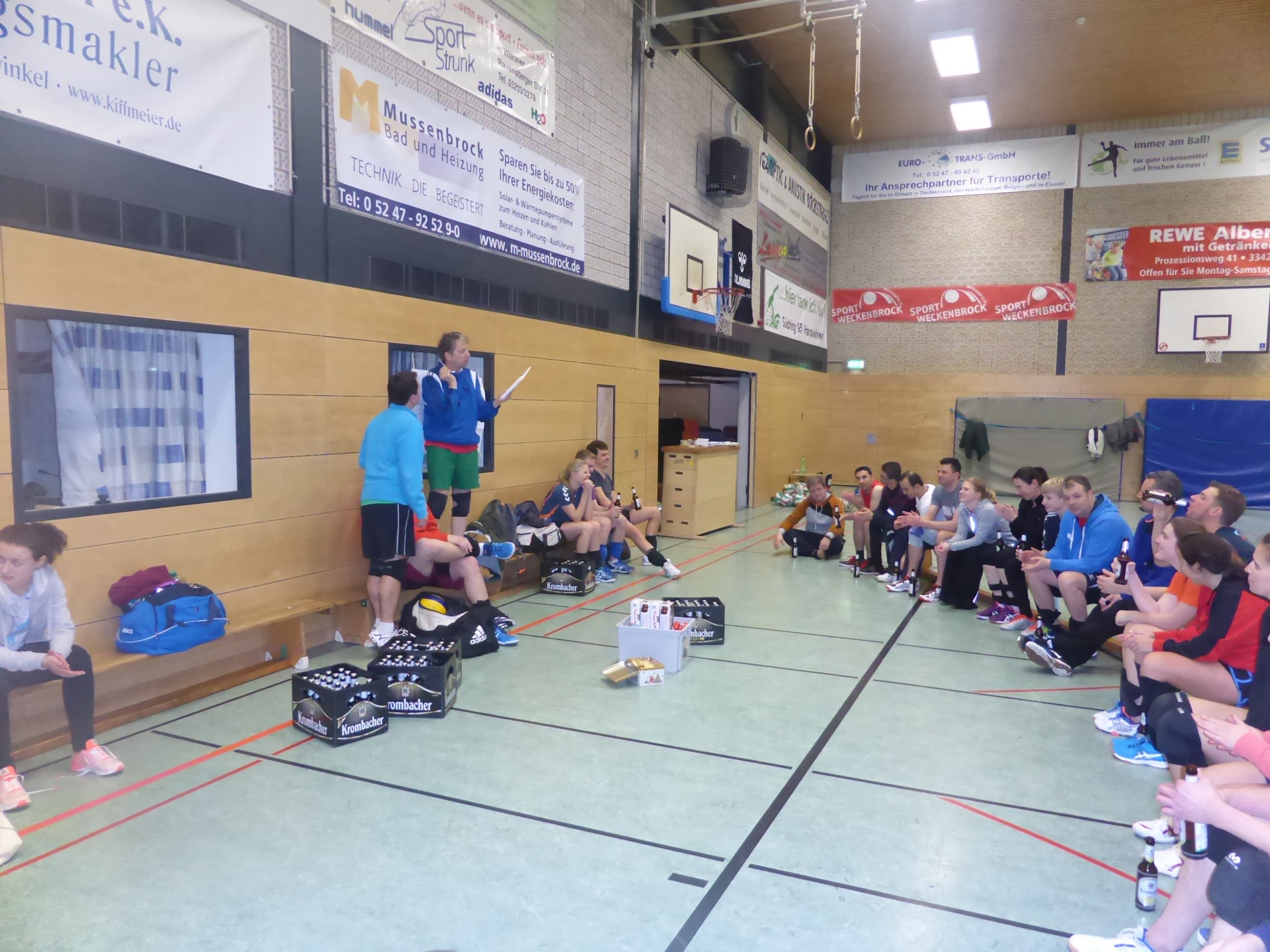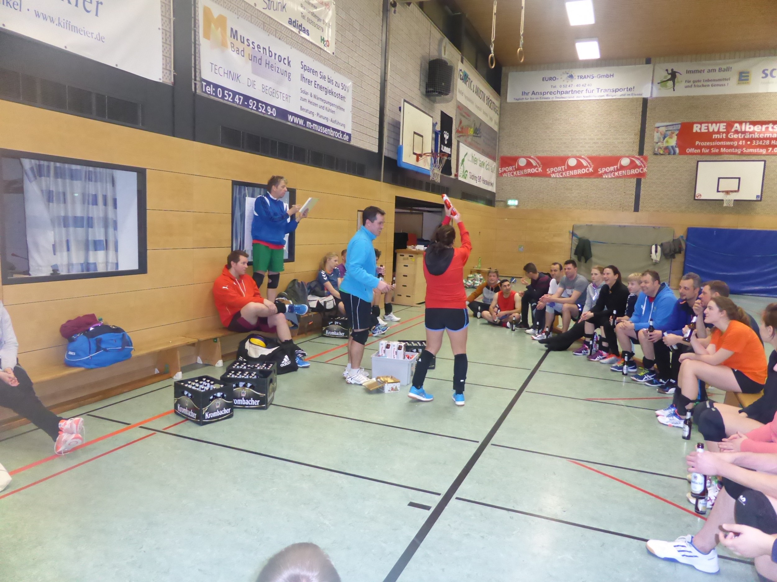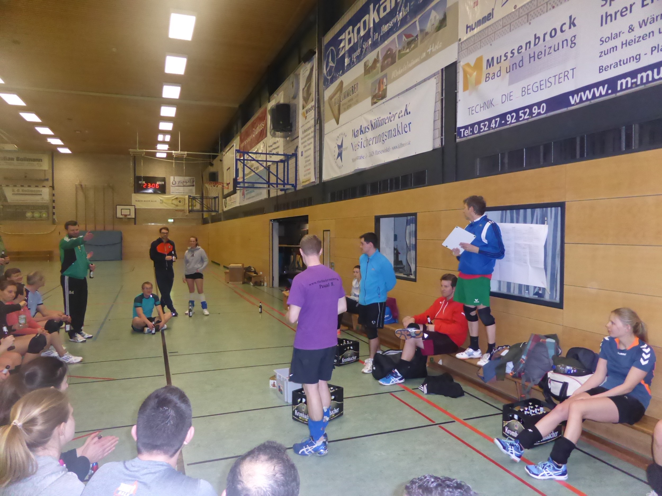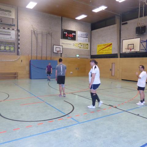 Zuerst wurden sechs weihnachtliche Teams ausgelost wie z. B. Christkinder oder Nikoläuse. Dann startete, nach kurzer Aufwärmphase, das Turnier. Jedes Team hatte fünf Spiele zu bestreiten, die jeweils zwei Sätze à 10 Minuten dauerten. Bei diesem schönen Weihnachtsturnier stand natürlich, wie in jedem Jahr, vor allen Dingen der Spaß im Vordergrund, auch wenn es leider einen Verletzten gab. Auf diesem Wege ganz viele Genesungswünsche.