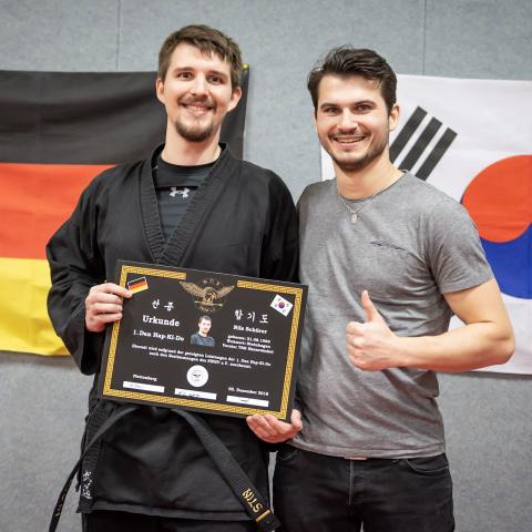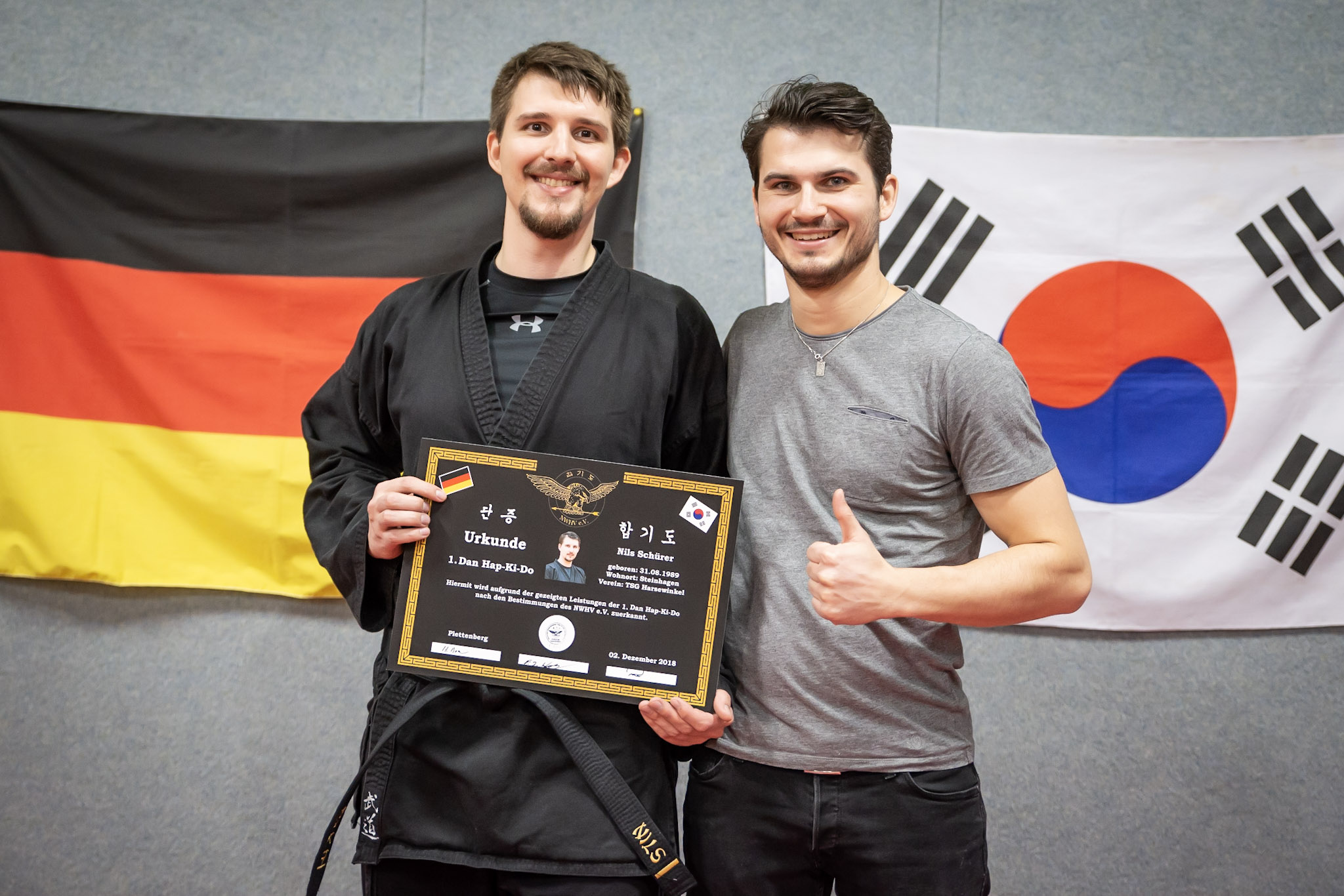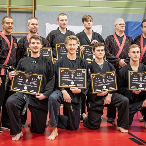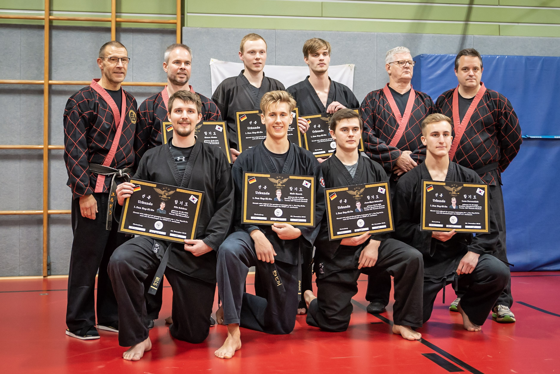 Aus Harsewinkel trat Trainer und Abteilungsleiter Nils Schürer zu einer 7-Stündigen Prüfung im Hapkido an und hat am Ende des Tages seinen neuen Gürtel von drei Großmeistern des Landes erhalten, welche diese Prüfung abgenommen haben.