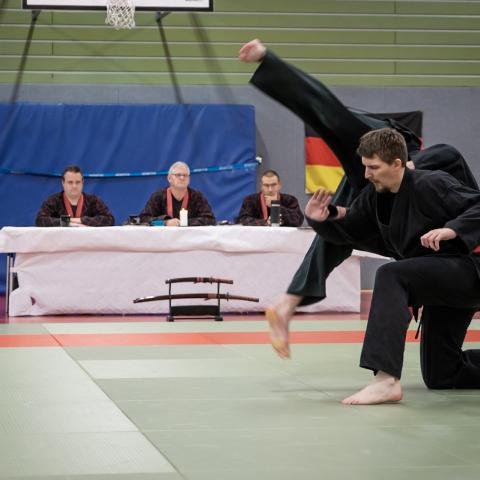 Jegliche Disziplinen wie Fußtechniken, Fallschule, Handtechniken, Kampf, freie Abwehr, Formenlauf und Bruchtest müssen in ausgezeichneter Ausführung vorgewiesen werden, um diese Prüfung zu bestehen.
