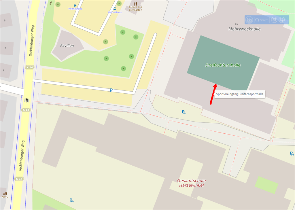 Besucher gehen über den Eingang Mehrzweckhalle --> Durchgang Cafeteria in die Dreifachsporthalle.