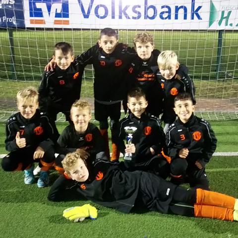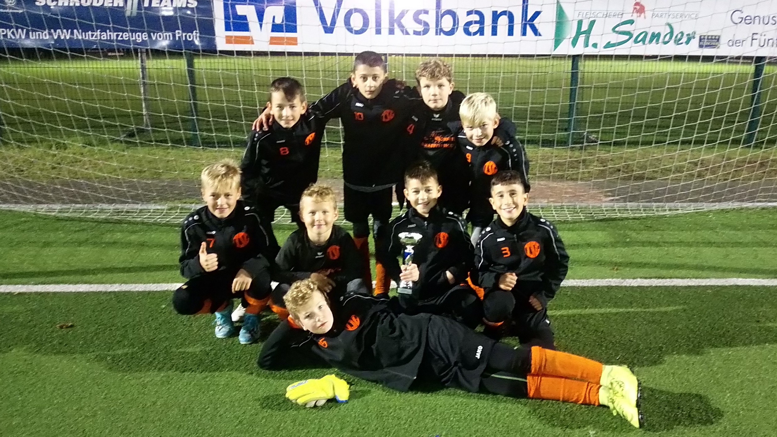 In einem, mit 36 Mannschaften und zum großen Teil sehr gut besetzten Turnier in Schloß Holte, unter andrem mit SC Verl, Hombrucher SV, SV Avenwedde, SV Spexard, Kreisauswahl Paderborn, VfB Fichte uvm., erwischten unsre Jungs einen unglücklichen Start mit 2 Niederlagen in den ersten drei Spielen. Ab diesem Zeitpunkt fanden sie jedoch immer besser ins Turnier und wurden von Spiel zu Spiel stärker. Am Ende der Vorrunde erreichte man den 2. Platz in der eigenen Gruppe, knapp hinter der Kreisauswahl aus Paderborn. So zogen sie nun in die Goldrunde, inder man auch auf den späteren Turniersieger VfB Fichte traff. In der Goldrunde wurde kein einziges Spiel verloren und unsre Kicker verpaßten nur aufgrund der um ein Tor schlechteren Tordifferenz im Vergleich zu Fichte, das Endspiel denkbar knapp. Nichts desto trotz können sie stolz auf sich sein, denn im Kampf um Platz drei bewiesen sie starke Nerven und entschieden das 9 Meter Schießen mit 5 von 5 versenkten Toren für sich. Starke Leistung, starke Mentalität, weiter so!