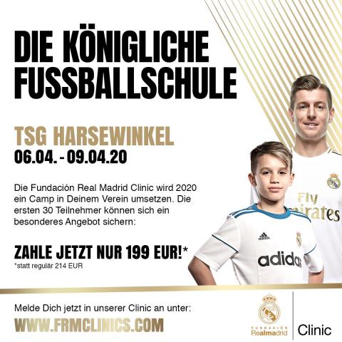 Vom 6. bis 9. April 2020 findet im Moddenbachtalstadion das “Fußballcamp der Königlichen” statt, eine Fußballschule der Fundación Real Madrid Clinic in Kooperation mit der TSG Harsewinkel. Das viertägige Camp für 7 bis 16-jährige Mädchen und Jungen besteht aus zwei Trainingseinheiten pro Tag plus tägliches Warm Up und Mittagessen.