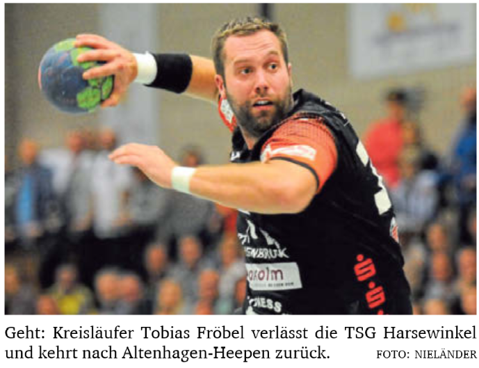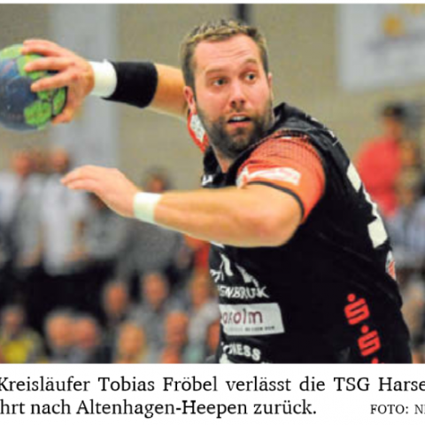 Tobias Fröbel wird Ende März beim Handball-Oberligisten TSG Harsewinkel ausscheiden und zu seinem Stammverein TSG A-H Sielefeld zurückkehren..,Wir haben der Bitte dieses verdienten Spielers nach einer Auflösung seines eigentlich bis zum 30.Juni laufenden Vertrages zum 1. April entsprochen", bestätigte der Harsewinkeler Teammanager Kari-Heinz Kalze eine Meldung des Ligarivalen.