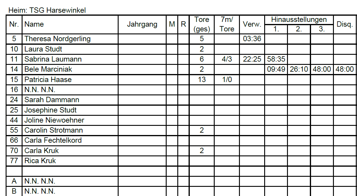 TSG Harsewinkel: Patricia Haase (13), Sabrina Laumann (6), Theresa Nordgerling (5), Laura Studt (2), Carolin Strotmann (2), Bele Marciniak (2), Carla Kruk (2), NN. NN., Josephine Studt, Joline Niewoehner, Rica Kruk, Carla Fechtelkord, Sarah Dammann. Offizielle: N.N. N.N., N.N. N.N.