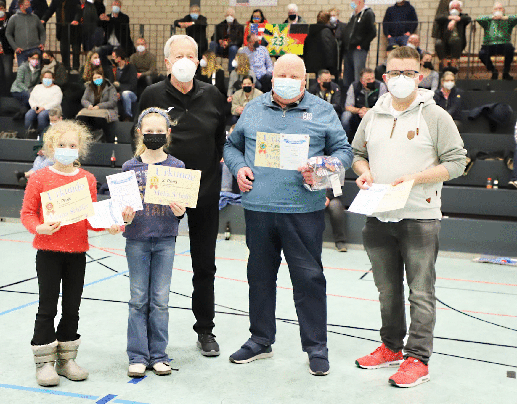Die Preise wurden in der Halbzeitpause des spannenden Heimspiels der 1. Herren gegen Gladbeck am 12. März ,moderiert von Abteilungsleiter Hans Feuß, vergeben. Jeder Teilnehmer erhielt neben einer Urkunde, einen Gutschein, der beim Kauf von Artikeln – Trikots, Schal usw. – eingelöst werden kann. Das Foto zeigt von links: Leana und Melia Schäfer, Manfred Baedeker, Franz Alke, Philipp Marmulla.