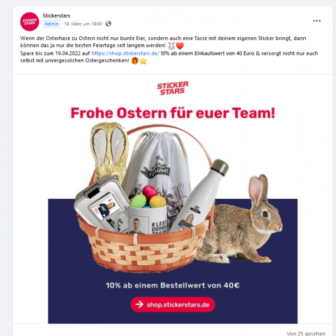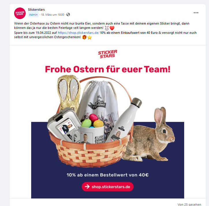 Spare bis zum 19.04.2022 auf https://shop.stickerstars.de/ 10% ab einem Einkaufswert von 40 Euro & versorgt nicht nur euch selbst mit unvergesslichen Ostergeschenken!"