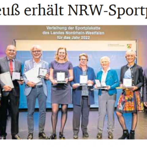 Staatssekretärin Andrea Milz (links) hat 15 Bürger für ihre besonderen Verdienste um den Sport mit der Sportplakette des Landes Nordrhein-Westfalen ausgezeichnet. Unter den Geehrten war auch Hans Feuß (3.v.li.) aus Harsewinkel.