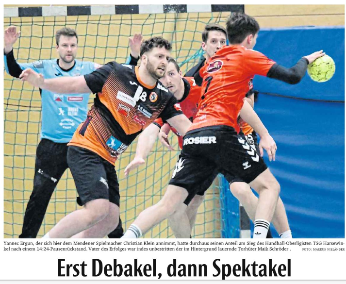 Oberligist TSG Harsewinkel reißt ein zur Pause beim 14:24 verloren geglaubtes Spiel gegen die SG Menden aus dem Feuer und die Zuschauer im Hasenbau von den Sitzen.