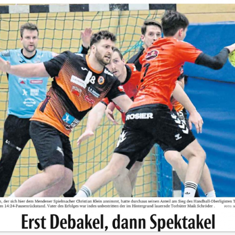 Als Max Schlögl 15 Sekunden vor Schluss beim 36:35 zum finalen Gegenstoß ansetzte, war es mucksmäuschenstill. Die 500 Zuschauer hielten den Atem an und stöhnten laut auf, als Schlögl den Ball an die Latte knallte. Der Abpraller aber landete bei Liam Lindenthal – und der versenkte den Ball zum 37:35. Die Halle tobte. „Bekommt Menden da den Ball, kassieren wir womöglich noch den Ausgleich“, mutmaßte Mühlbrandt, der nach einer desaströsen ersten Halbzeit die Kabinenwände wackeln ließ. „Da haben wir einen kleinen Einlauf bekommen“, bestätigte Lindenthal. „Es wurde noch einmal alles angesprochen. Wir haben unsere Fehler reflektiert, uns gegenseitig gepusht und die Köpfe wieder hoch genommen“.