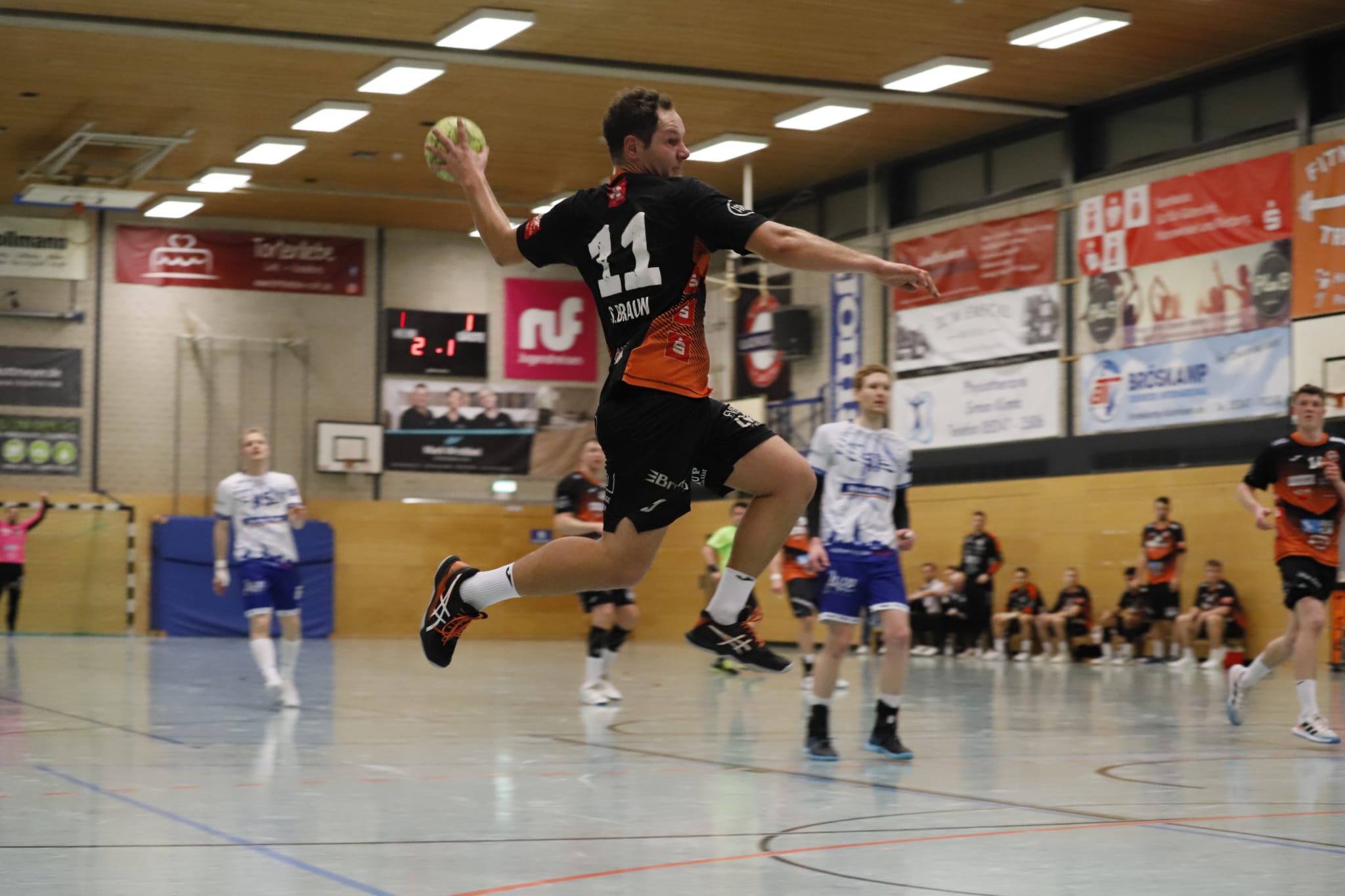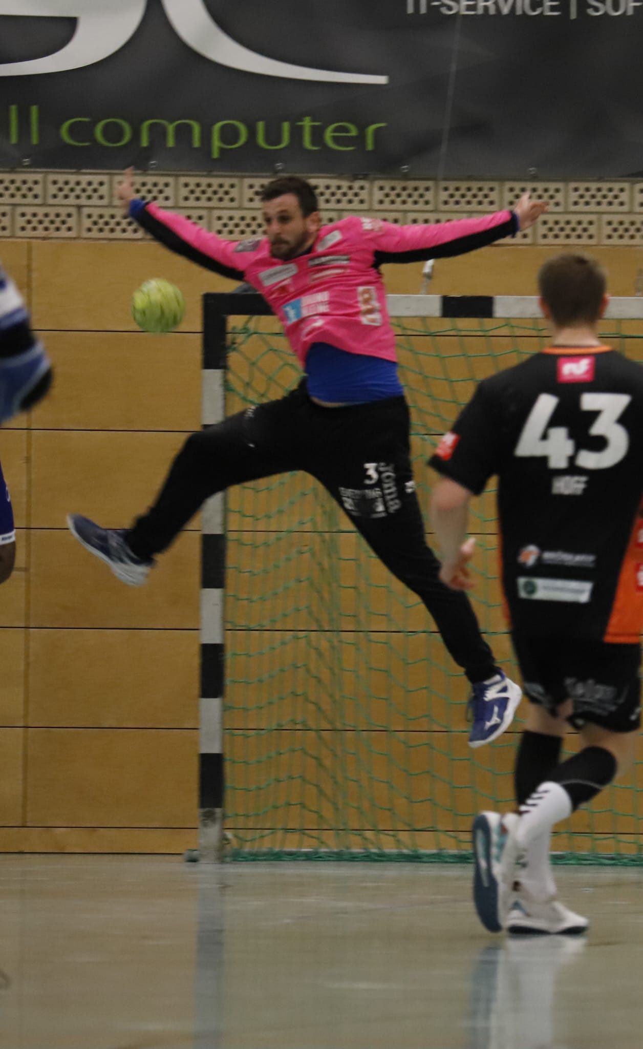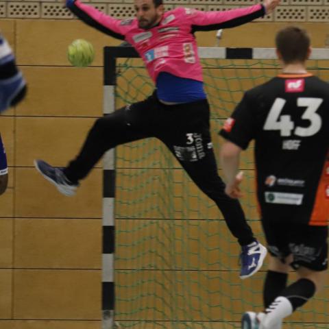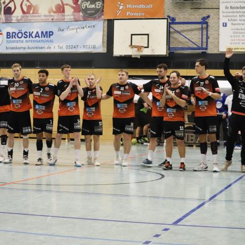 Die lag deshalb beim 25:29 in der 44. Minute klar hinten und schien beim 34:32 durch den diesmal lange spielenden und zum Ende besser in Schwung kommenden Florian Bröskamp wieder auf der Siegerstraße. Dazwischen lagen Gegentreffer ins leere Tor, weil der Ball (Robert Indeche leistete sich gleich in drei Angriffen in Folge böse Ballverluste) oder beim Gegenstoß.