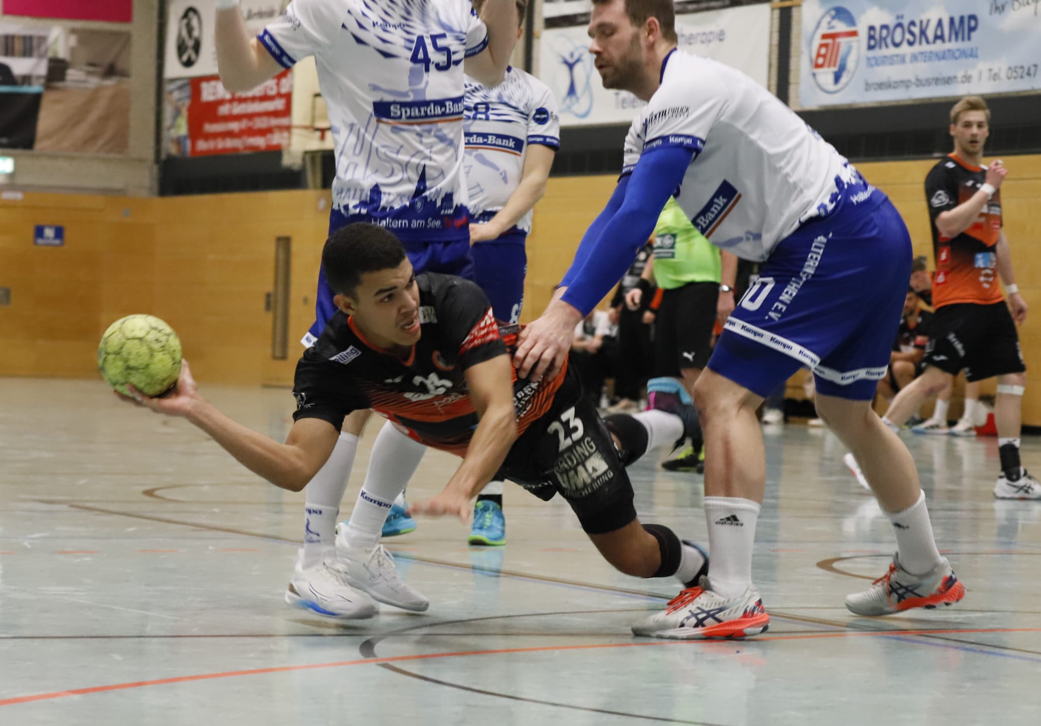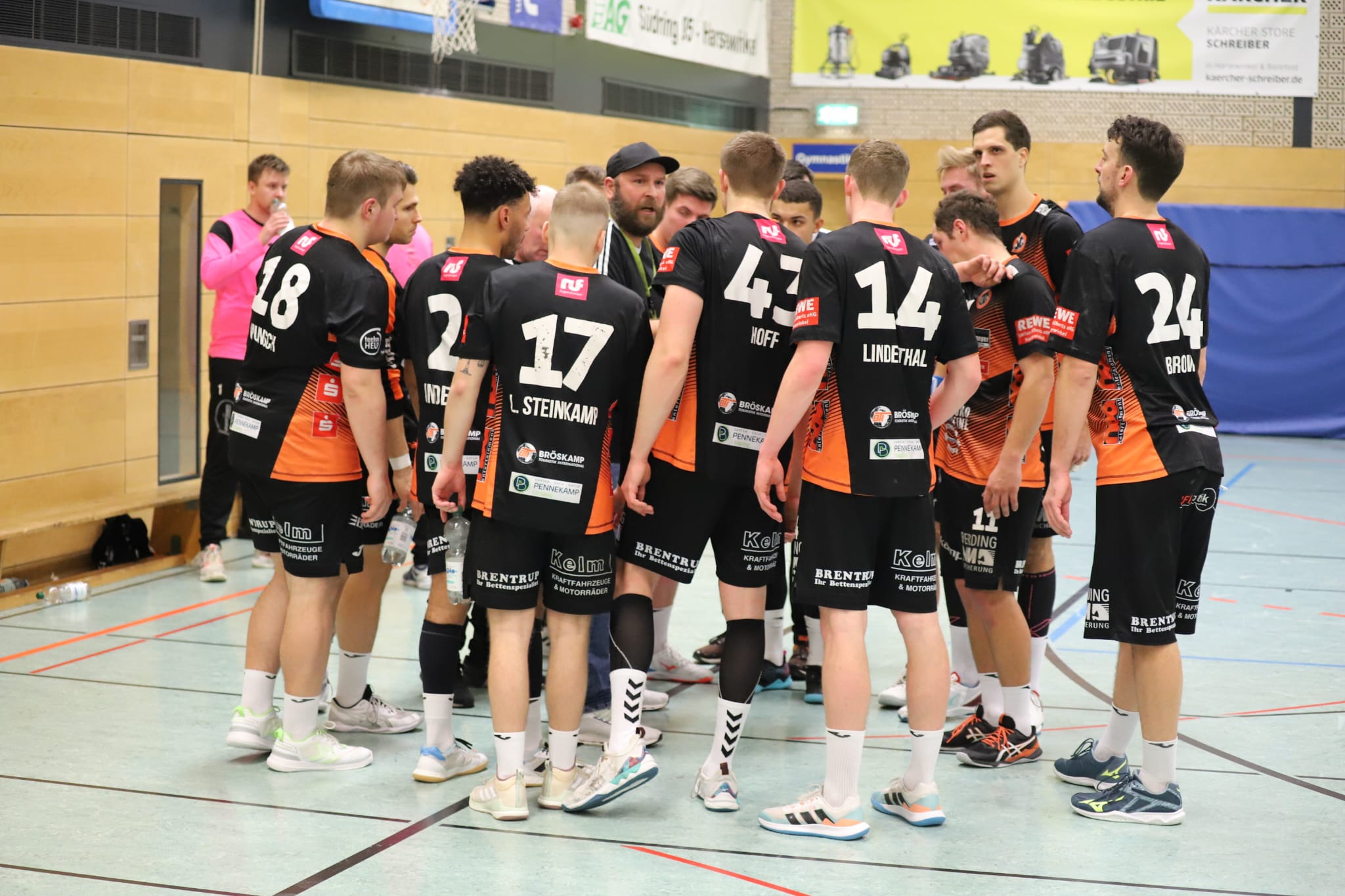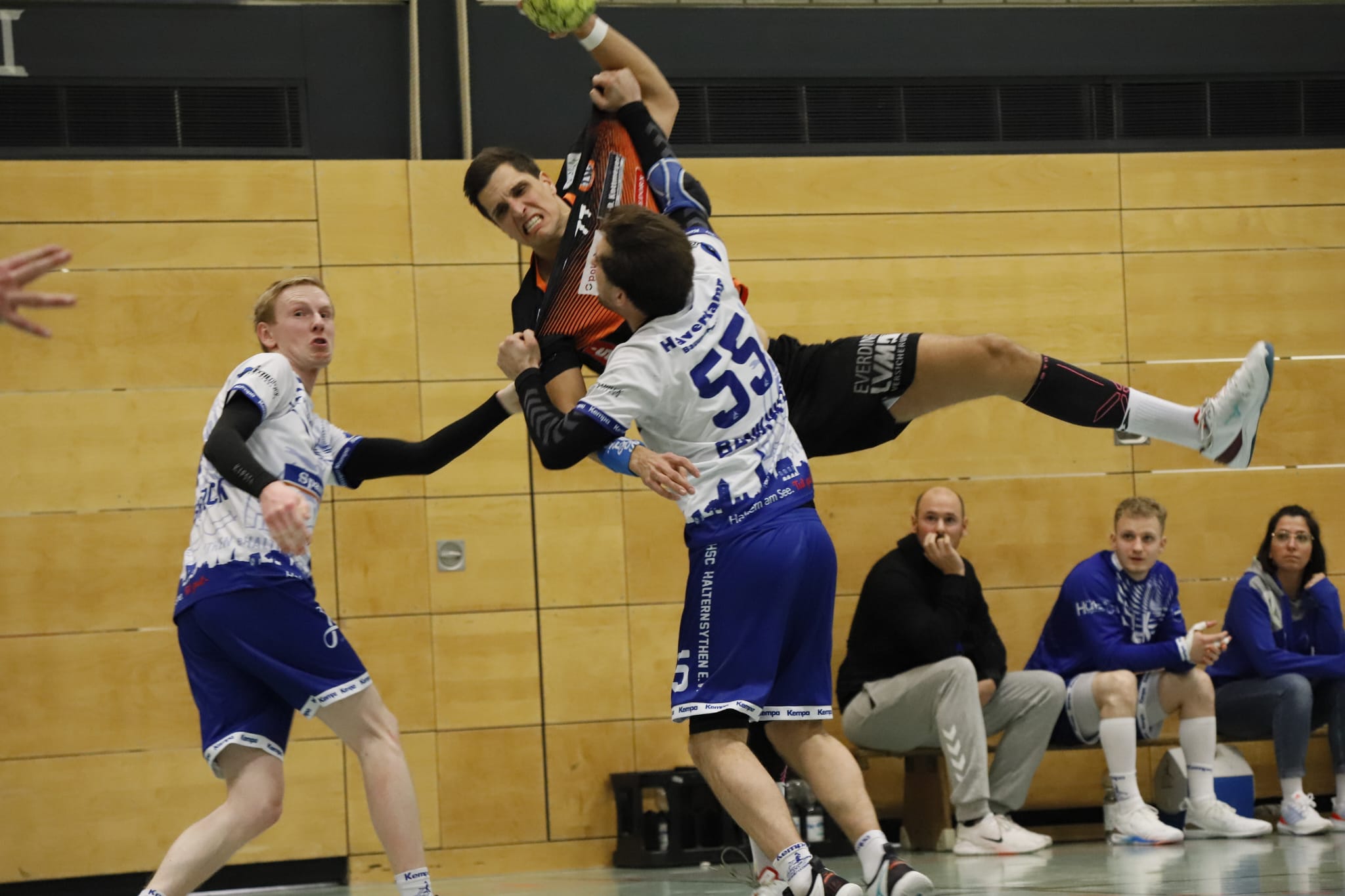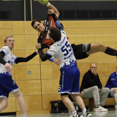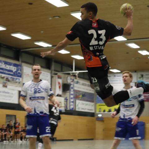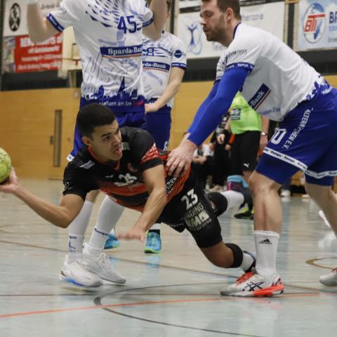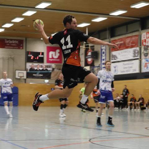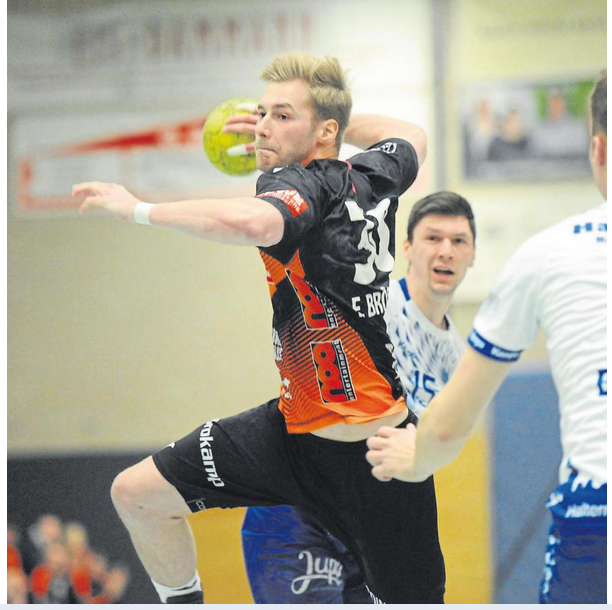 Dabei waren die Hausherren ohne Heiner Steinkühler und den bis zur 44. Minute ebenfalls auf der Tribüne sitzenden Kreisläufer Max Schlögl gut gestartet und im torreichen Schlagabtausch mit 5:2, 6:3 und 7:4 in Führung gegangen. Doch mit ihrer nie versiegenden Kampfkraft und mit einer Manndeckung gegen Luca Sewing kam Haltern zurück zum 11:11, bevor das Pendel erneut zugunsten der Harsewinkeler kippte und bis zum Pausenpfiff dort auch blieb.