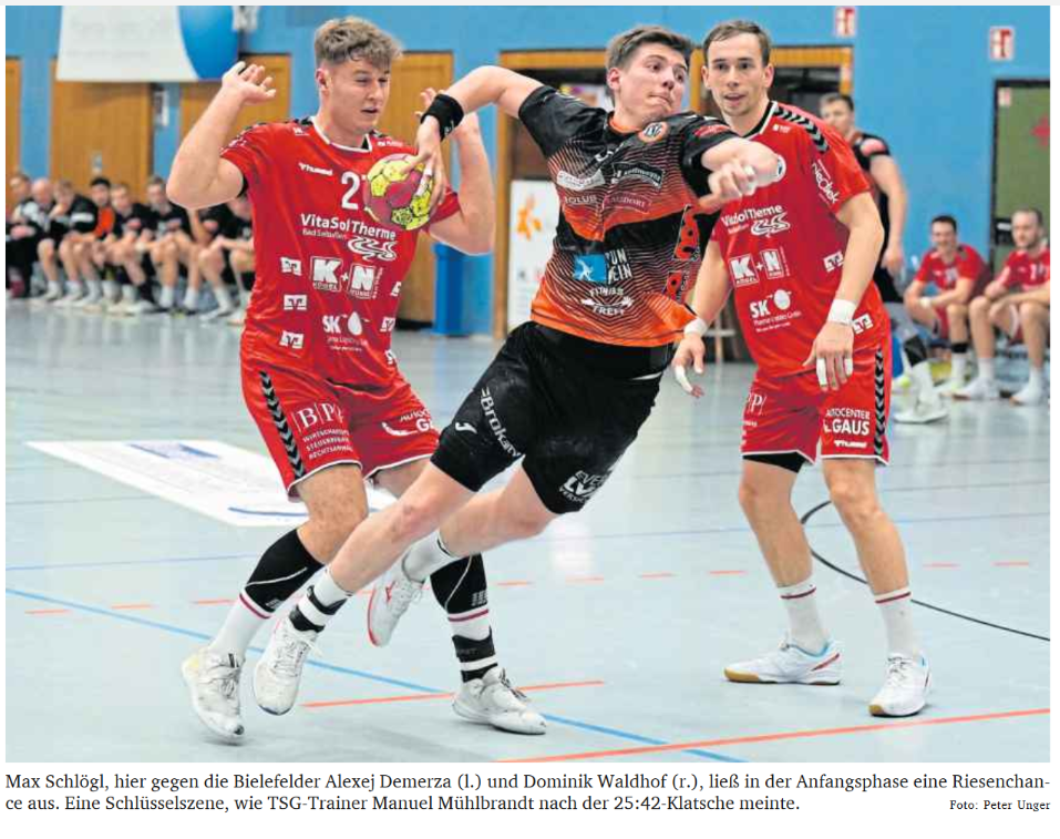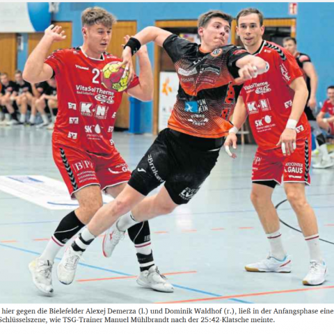 Als Knackpunkt der Partie sah Manuel Mühlbrandt bereits die Szene beim Spielstand von 5:5 an, als Kreisläufer Max Schlögl an Dennis Doden scheiterte. „Und unsere erste Überzahl haben wir mit 0:3 verloren. Danach sind wir in einen negativen Lauf reingekommen“, sagte „Mühle“. Als „Wahnsinn“ bezeichnete es der TSG-Coach, wie beim Gastgeber im Angriff gearbeitet wurde. „Da hat man die ganze Qualität gesehen“, konnte Mühlbrandt oftmals gar nicht so schnell gucken, wie schnell die Bielefelder „abräumten“ und immer wieder ihre Außen in exzellente Abschlusspositionen brachten. Nicht von ungefähr waren es am Ende 19 Gegentreffer, die die Harsewinkeler von außen kassierten.