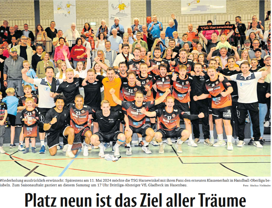 Der umjubelte Klassenerhalt der TSG Harsewinkel in der Handball-Oberliga ist 14 Wochen her. Wenn an diesem Samstag mit dem Heimspiel gegen Drittliga-Absteiger VfL Gladbeck (17 Uhr) die Saison 2023/24 beginnt, geht es wiederum um nichts anderes als den Ligaverbleib.