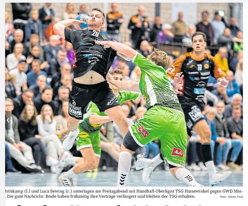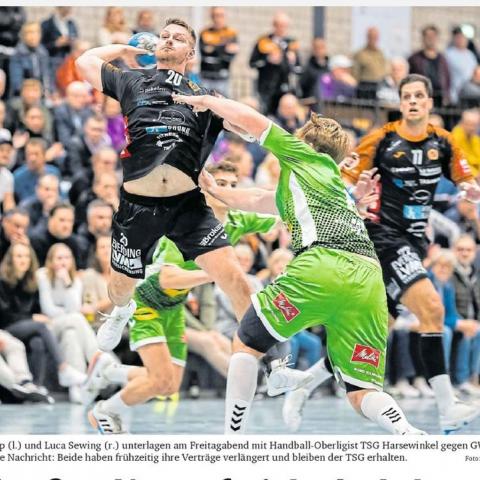 Auf dem Handball-Feld ist die TSG Harsewinkel beim 31:34 (19:18) gegen das Oberliga-Topteam GWD Minden II leer ausgegangen, bei der Personalplanung für die neue Saison können dafür zwei Erfolge vermeldet werden: Kapitän Sven Bröskamp hat seinen Vertrag um zwei Spielzeiten verlängert, Haupttorschütze Luca Sewing um eine Saison.