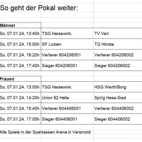 Unsere beiden Mannschaften - 1. Damen und 1. Herren - sind Gruppensieger geworden und spielen morgen in Versmold in der Sparkassenarena. Spielplan im Anhang.