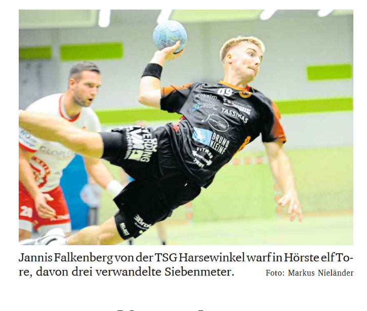 Das war knapp: Die TSG Harsewinkel hat auch das zweite Saisonspiel in der Handball-Regionalliga gewonnen, der 34:32 (20:18)-Erfolg beim Außenseiter TG Hörste forderte aber die letzten Kraftreserven. Vor einer stimmungsvollen Derby-Kulisse von gut 450 Zuschauern war auch Trainer Manuel Mühlbrandt hinterher völlig geschafft: „Wir sind glücklich, hier dreckige zwei Punkte mitgenommen zu haben.“