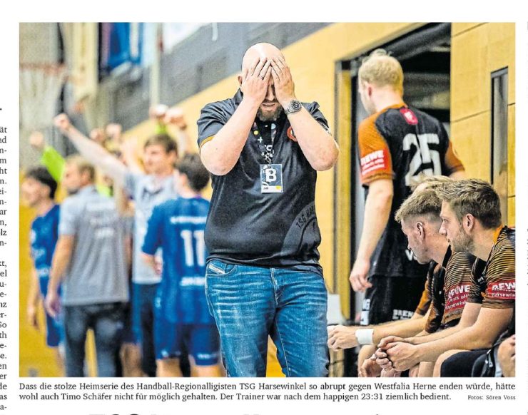Eine mögliche Wende verpassten die Hausherren dann zu Beginn der zweiten Halbzeit, als innerhalb von zweieinhalb Minuten Liam Lindenthal (Siebenmeter), Sven Bröskamp (frei vor) und Marlon Meyer (aufs leere Tor) drei Großchancen ausließen. Harsewinkel blieb acht Minuten ohne Tor und selbst Linkshänder Mika Kösters, der bis dahin alle drei Versuche versenkt hatte, traf jetzt nicht mehr. Mit schließlich 17 technischen Fehlern brachte die zweite Halbzeit viel Ernüchterung, einen Rückstand von zeitweise zehn Toren (17:27, 50.) und die Erkenntnis, dass TSG-Trainer Timo Schäfer und seine Schützlinge noch eine Menge Arbeit vor sich haben.