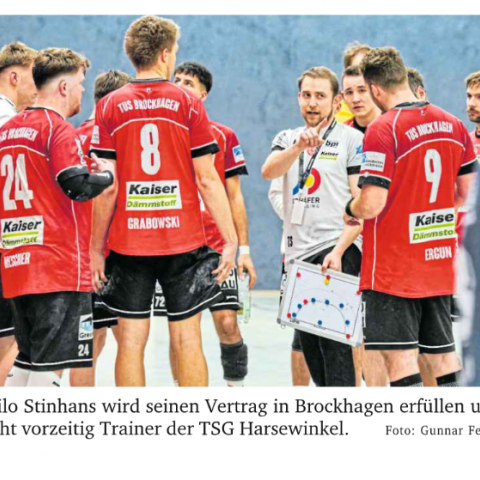 Harsewinkel (gf/dh). Thilo Stinhans hat mit dem TuS Brockhagen nach mehrwöchiger Durststrecke gegen Ahlen II einen wichtigen Sie eingefahren – und der Arbeit beim Aufsteiger in die Handball-Oberliga gilt auch in den kommenden Wochen und Monaten der Fokus des Trainers. Nach dem Rücktritt von Chefcoach Timo Schäfer bei Regionalliga-Schlusslicht TSG Harsewinkel schwirrten am Wochenende viele Gerüchte durch die Hallen – Quintessenz: Stinhans, der wie berichtet nach Saisonende zur TSG wechselt, könne vielleicht schon vorzeitig als Retter bei seinem künftigen Club in die Bresche springen.