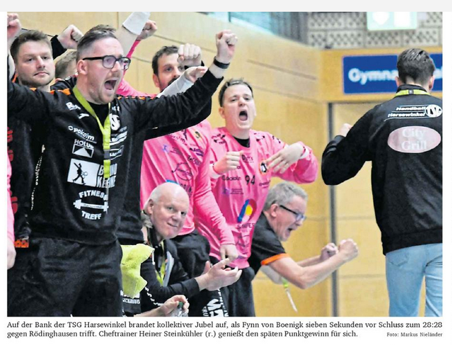 Felix Hendrich gefiel die gedrückte Stimmung am Freitagabend im Hasenbau überhaupt nicht. „Kopf hoch und positiv bleiben“, sagte der Torhüter der TSG Harsewinkel beim Blick in die miesepetrigen Gesichter um ihn herum. Das 28:28 (11:17) gegen den CVJM Rödinghausen fühlte sich für den Handball-Regionalligisten wie eine Niederlage an, dabei hatte der Tabellenletzte sogar großes Glück, dass er überhaupt einen Punkt behalten durfte.