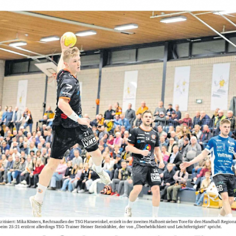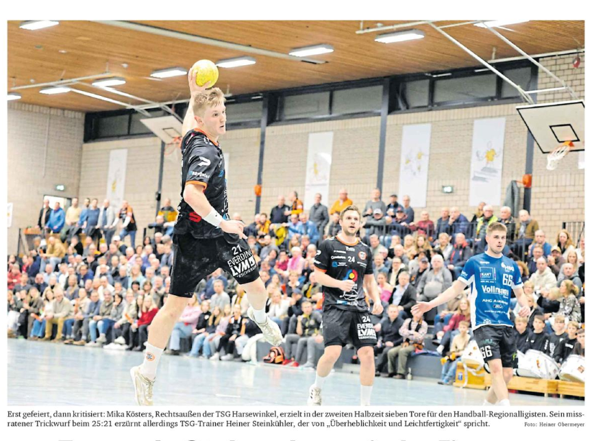 „Es ärgert uns massiv, dass wir gegen eine so dezimierte Mannschaft nicht gewinnen können. Das ist unfassbar, so etwas darf uns nicht passieren“, sagt Heiner Steinkühler, der kurzfristig auf Robert Indeche (Wadenprobleme) verzichten muss. Zur Ironie des Harsewinkeler Schicksals gehört, dass mit Liam Lindenthal, Mika Kösters und Stefan Bruns ausgerechnet die drei tragenden Säulen im Spiel der TSG am Ende zu tragischen Figuren werden.