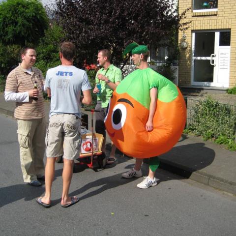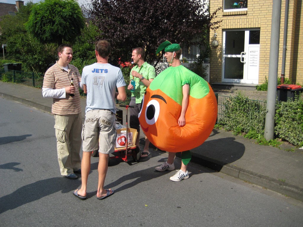 Am 25 Juli musste Axel "Apfel" Schillenkamp zu seinem 30 Geburtstag die Rathaustreppen fegen. Weil er auf den Weg dorthin mehere Schnäpse trinken müsste, wurde es nicht nur für Ihn ein voller (hicks) Erfolg. Seine Clique und sein Stammtisch "angeschlagen aber glücklich"hatten sich was Tolles einfallen lassen. An jeder Laterne musste er würfeln und je nach Augenzahl unterschiedliche Liköre zu sich nehmen. Nur bei der Augenzahl 6 dürfte ohne zu trinken weiter gehen, bei der Augenzahl 1 musste er eine Laterne zurück gehen. Am Rathaus konnte dann relativ schnell eine Jungfrau den Charme eines Handballers nicht wiederstehen und hat Ihn freigeküsst.