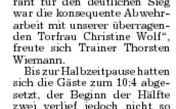 Am Pokalwochenende spielten unsere Mädels gegen die weibl. A-Jugend aus Hesselteich. Zu Beginn waren sich die Mädels nicht sicher, ob sie das Viertelfinale überstehen würden, doch die Mannschaft (2 A-Jugendliche und 6 B-Jugendliche) kämpfte sich ins Spiel und baute kontinuierlich die Führung aus, so